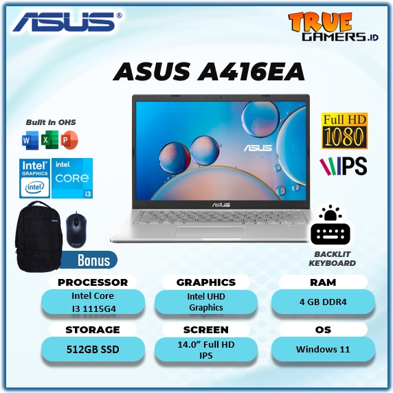 Juga punya 4 Produk lain terkait Produk ASUS A416EAO VIPS353 Intel Core I3 1115G4 RAM 4GB 512SSD WINDOWS11+OHS 14.0FHD IPS yang perlu Anda lirik karena menarik, Produk itu adalah....
