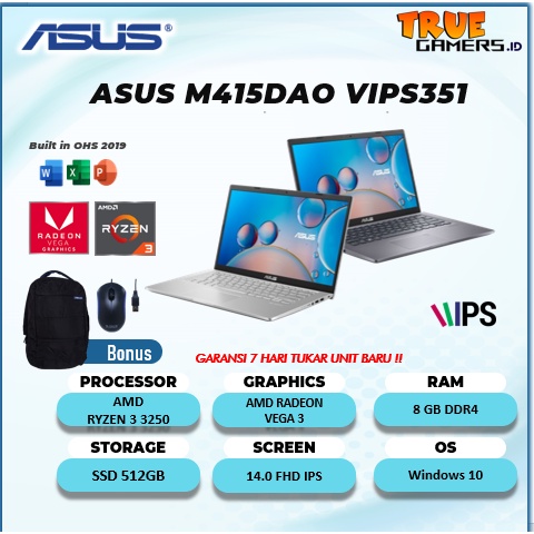 Grosir ASUS M415DAO VIPS352 RYZEN 3 3250 8GB 512SSD VEGA3 WIN10+OHS 14.0FHD IPS garansi ori untuk seluruh Indonesia dht