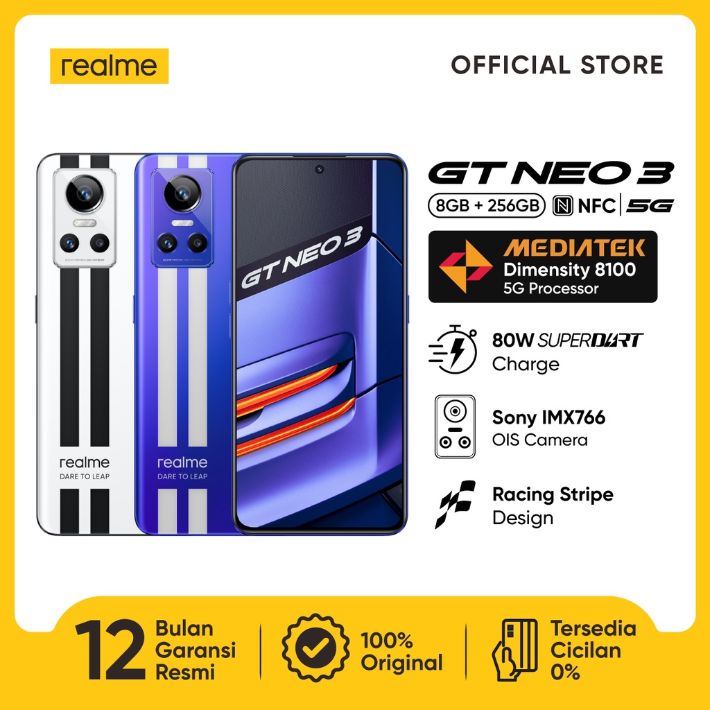Pusat ditributor online Realme GT Neo 3 80W 8+256GB Dimensity 8100 5G | 80W Charge | Sony IMX766 OIS Camera 120Hz 5000mAh untuk seluruh Indonesia nvh